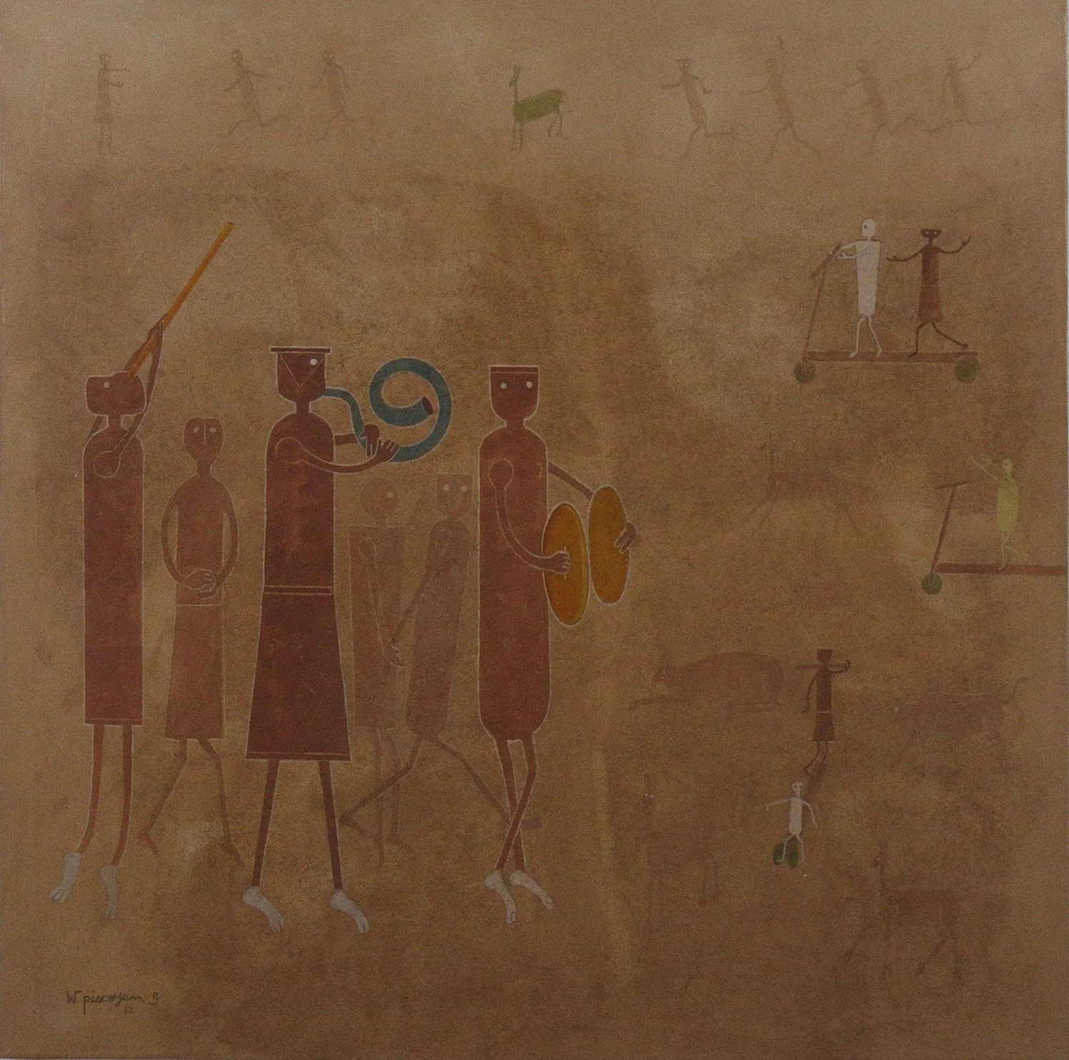 Born in Chiclayo, Peru -Piscoya's paintings are strongly symbolic. Discreet and with a sparse composition, the works have a timeless quality yet recall an ancestral past. Based on pre-Columbian paintings, Piscoya creates every piece, including the paper he paints on, from sand and dust.work is rooted in pre-columbian-Iconographic. It is characterized by as unceasing struggle between Figurative and Abstract.